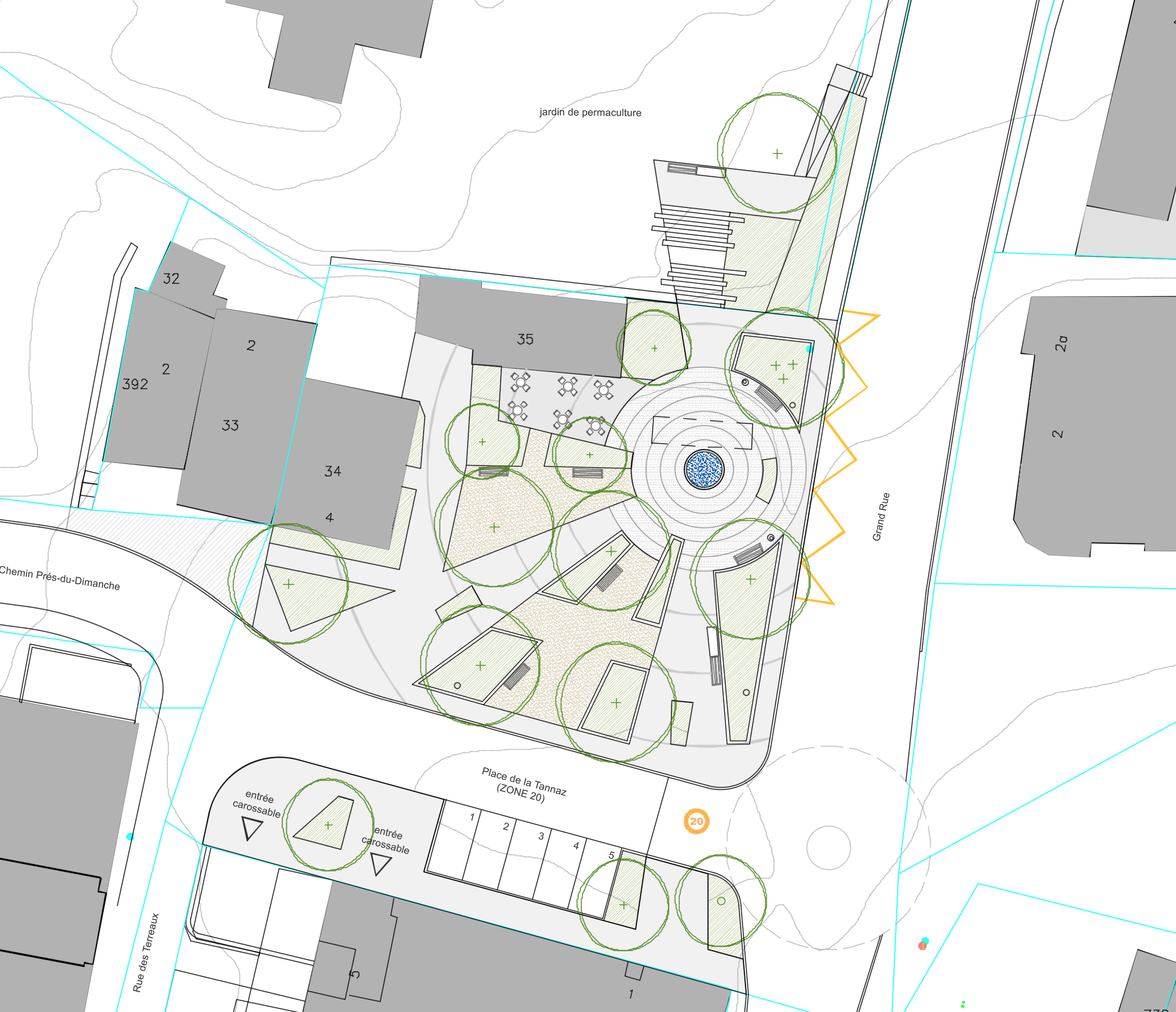 Sa configuration particulière guide la réorganisation de l’espace afin de rendre la place plus conviviale, fonctionnelle et attractive, en cohérence avec les besoins de la population et l’identité paysagère du lieu.